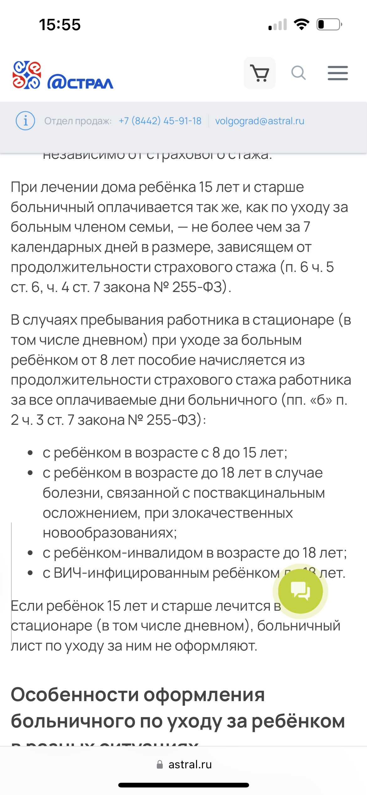 Если ребёнок 15 лет и старше лечится в стационаре (в том числе дневном), больничный лист по уходу за ним не оформляют.