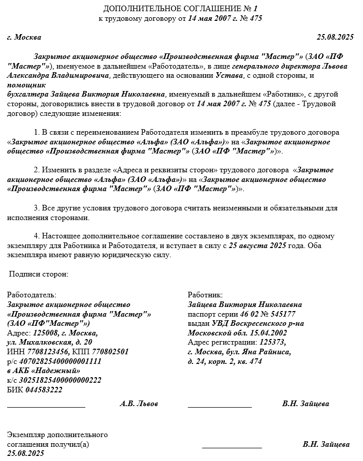 Изменение наименования юридического лица: дополнительное соглашение к трудовому договору