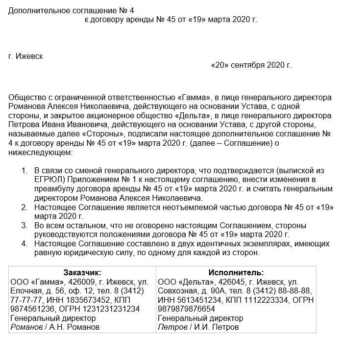 Договоры поставки, подряда, оказания услуг, аренды, лицензионные соглашения. Преамбула таких контрактов обычно содержит формулировку: «ООО "Ромашка" в лице генерального директора Иванова А.В., действующего на основании Устава». После смены руководителя эта запись утрачивает актуальность, и допсоглашение заменяет ФИО, а при необходимости и реквизиты документа-основания полномочий.