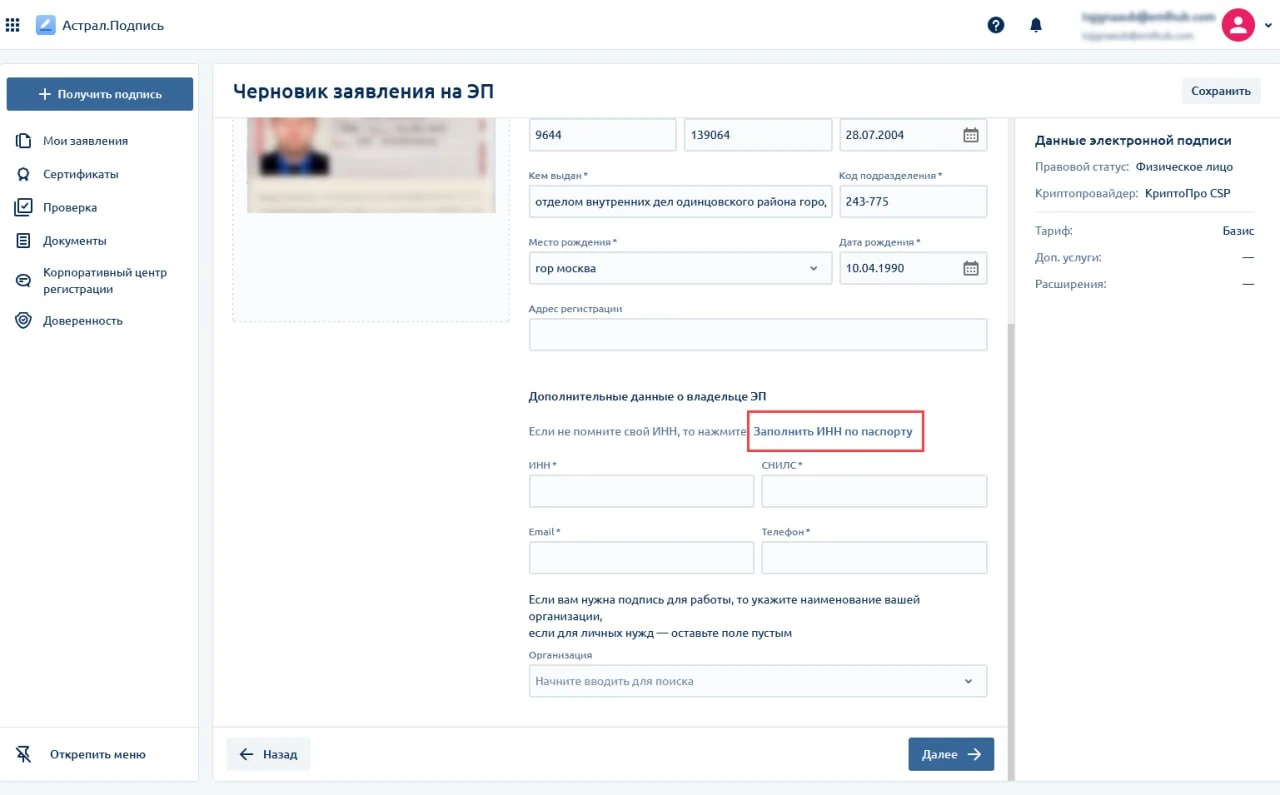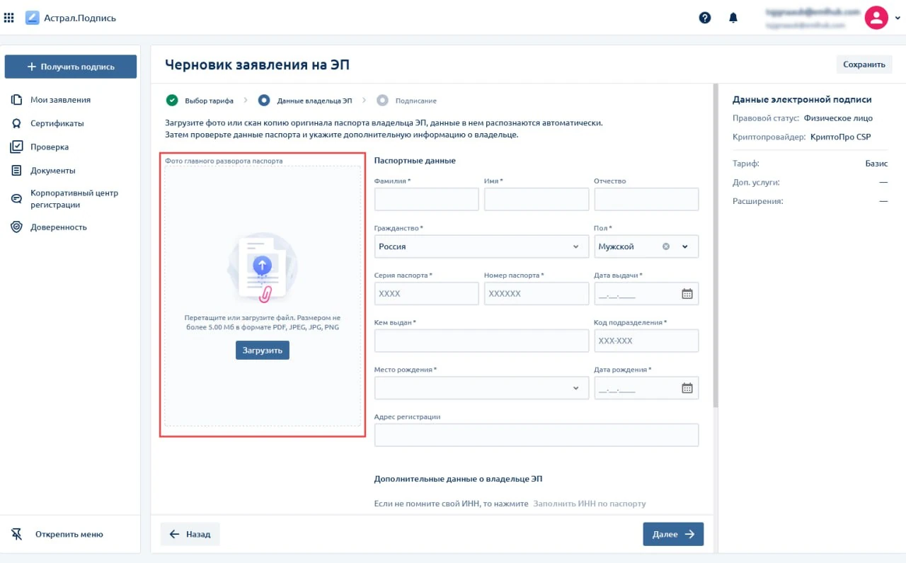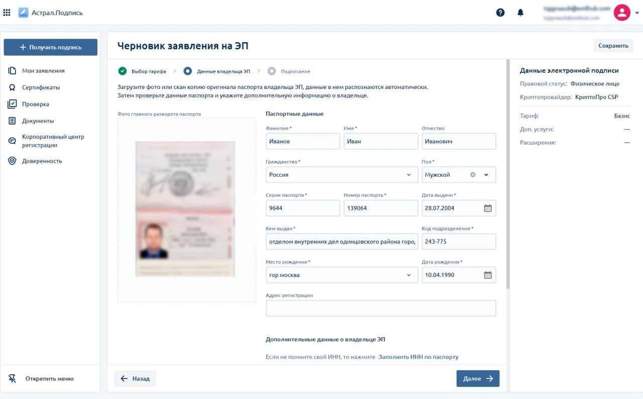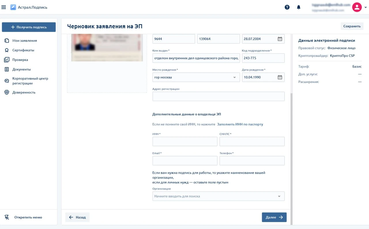 Откройте наш сервис Астрал Подпись и создайте учетную запись. Заполните заявление на выпуск сертификата: ФИО, паспортные данные, СНИЛС, контактная информация. Наша система проверит корректность введенных данных.