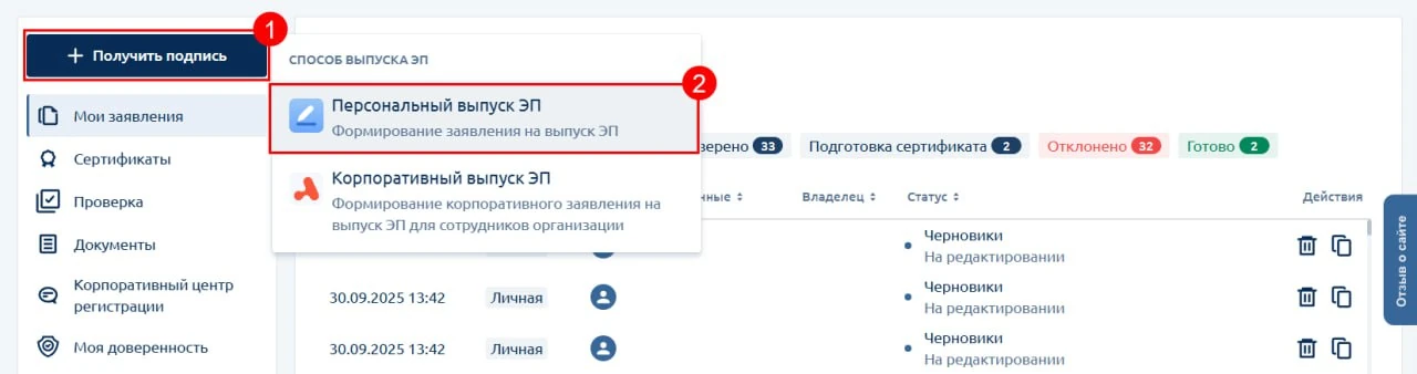 | Срок сертификата истекает | Подать заявку на новый сертификат за 14–30 дней до окончания | Нет, если подписать заявку действующей КЭП |