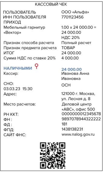 | Способ оплаты (теги 1031, 1081) | «Наличными» или «безналичными» |