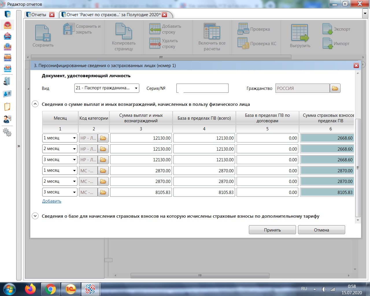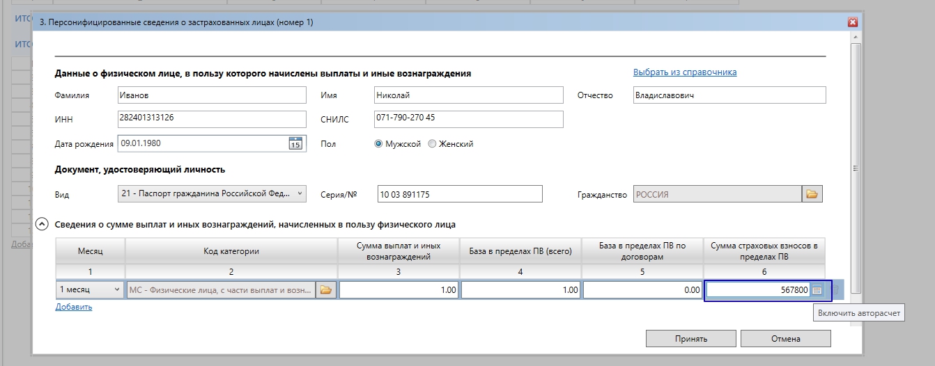 Добрый день. Все отлично изложено, тем не менее - при заполнении 3 раздела по сотруднику, при выборе категории МС - программа не рассчитывает взнос 10%, а дублирует в графу 6 сумму из графы 3 и 4. Просто ставит всю сумму выплат. При этом 22% (при категории НР) рассчитывает. Пусть бы и так, но вручную исправить данную ошибку программа (редактор отчетов) тоже не дает.