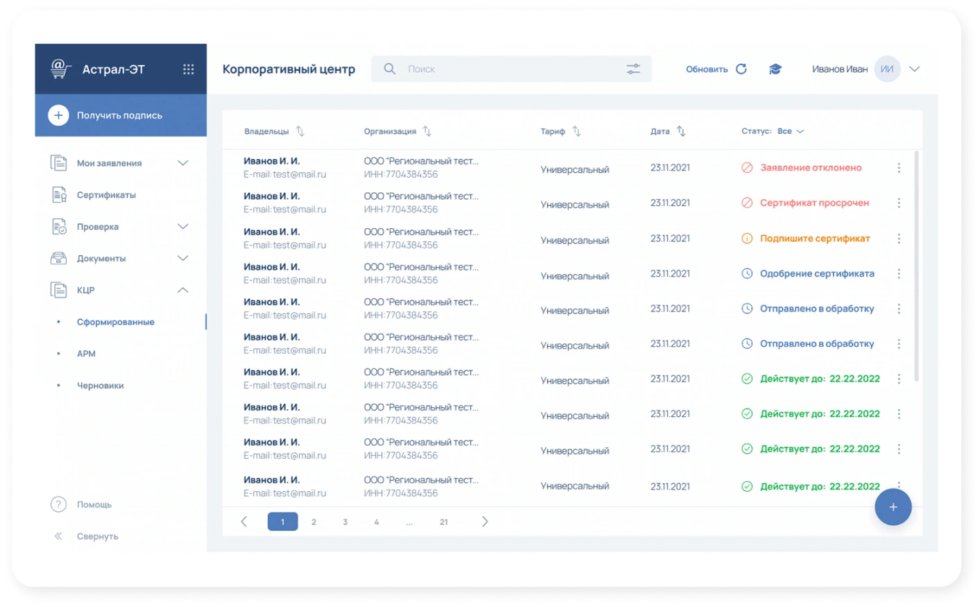 Сертификат УКЭП можно продлить дистанционно, пока он еще действует, без повторной очной идентификации. Если срок уже истек, потребуется новая очная идентификация через администратора КЦР. В медучреждениях с большим штатом врачей отслеживание сроков превращается в отдельную задачу. Сервисы КЦР (в частности, «Астрал.Подпись Корпоративный») предоставляют сводные отчеты по статусам всех сертификатов и уведомления о приближении сроков истечения.