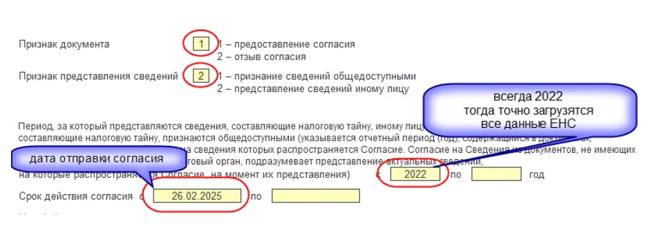 На 1 странице нужно проставить признак документа — 1 (предоставление согласия), признак представления сведений — 2 (представление сведений иному лицу), период, за который предоставляются сведения — с 2022 года.