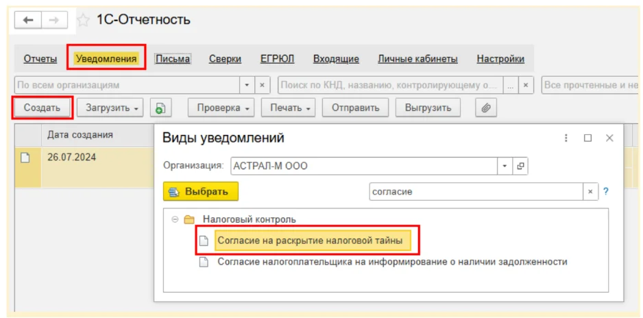 Отправить согласие из 1С можно, открыв раздел «Отчеты». Далее нужно перейти в подраздел «Регламентированные отчеты», а затем открыть вкладку «Уведомления» и нажать кнопку «Создать». Затем в папке «Налоговый контроль» нужно выбрать «Согласие на раскрытие налоговой тайны» и внести в документ необходимые сведения, а также указать срок его действия.