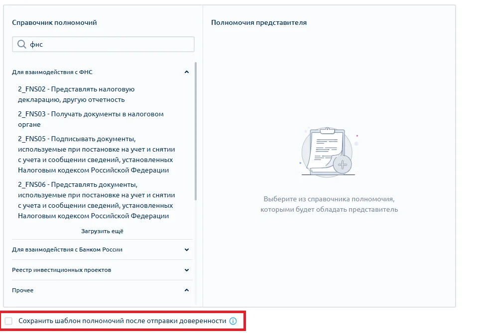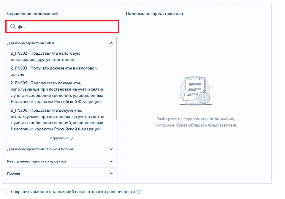 Сервис Астрал Доверенность предлагает не только строку поиска, но и готовые подборки, например, набор полномочий для взаимодействия с ФНС. Это решение упрощает выбор нужных кодов и экономит время.