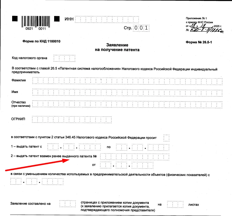 Основная причина обновления — приведение документации в соответствие с изменениями в Налоговом кодексе РФ. Федеральный закон от 28 ноября 2025 г. № 425-ФЗ внес поправки в статью 346.45 НК РФ. В частности, это касается уменьшения количества используемых в предпринимательской деятельности объектов, которые указаны в патенте индивидуального предпринимателя. В этом случае ИП имеет право подать заявление на получение нового патента вместо того, который был ему выдан ранее.