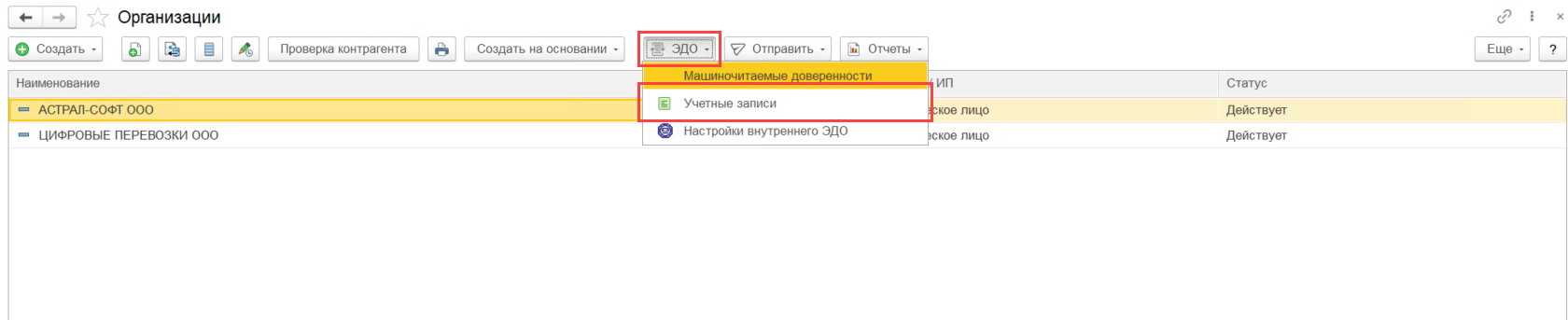 Для этого перейдите в справочник Организации. Выберите нужную организацию и нажмите ЭДО → Учетные записи: