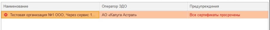 В открывшемся окне представлены учетные записи ЭДО выбранной организации. Предупреждение указывает, что в учетной записи отсутствуют действующие сертификаты, об этом же свидетельствует красный индикатор в начале наименования: