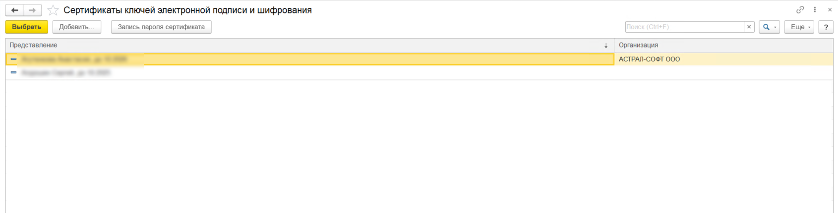 В открывшемся окне Сертификаты ключей электронной подписи и шифрования выберите актуальный сертификат электронной подписи. При отсутствии нужного сертификата нажмите кнопку Добавить... и выберите сертификат из хранилища сертификатов Личные операционной системы: