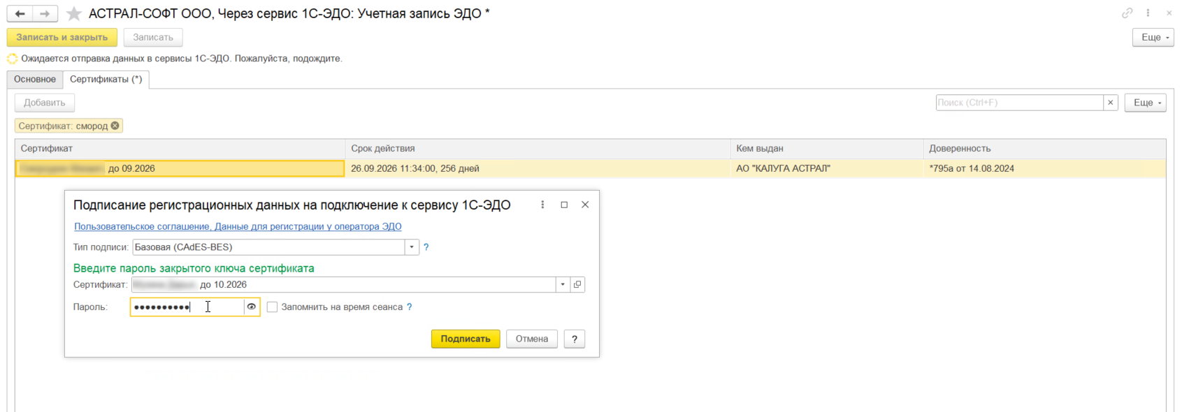 Откроется окно Подписание регистрационных данных на подключение к сервису 1С-ЭДО. Ознакомитесь с пользовательским соглашением на подключение к сервису 1С-ЭДО, затем введите пароль закрытой части ключа электронной подписи и нажмите Подписать. Если при выпуске сертификата пароль не был задан, то данное поле нужно оставить пустым: