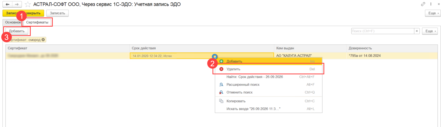 Откройте выбранную учетную запись и перейдите на вкладку Сертификаты (1). В представленном списке удалите истекшие сертификаты. Для этого правой кнопкой мыши нажмите на истекший сертификат и выберите Удалить (2). Для добавления нового сертификата нажмите кнопку Добавить (3):