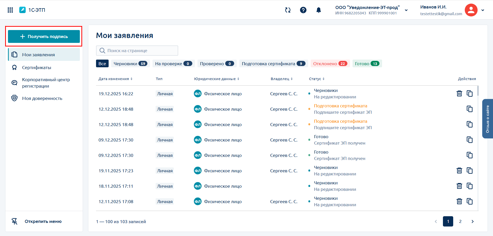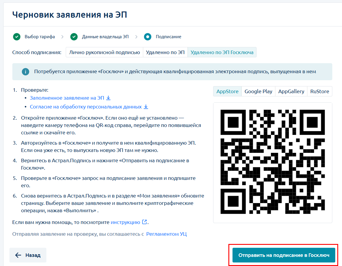 Для создания заявления на получение подписи нажмите кнопку Получить подпись: