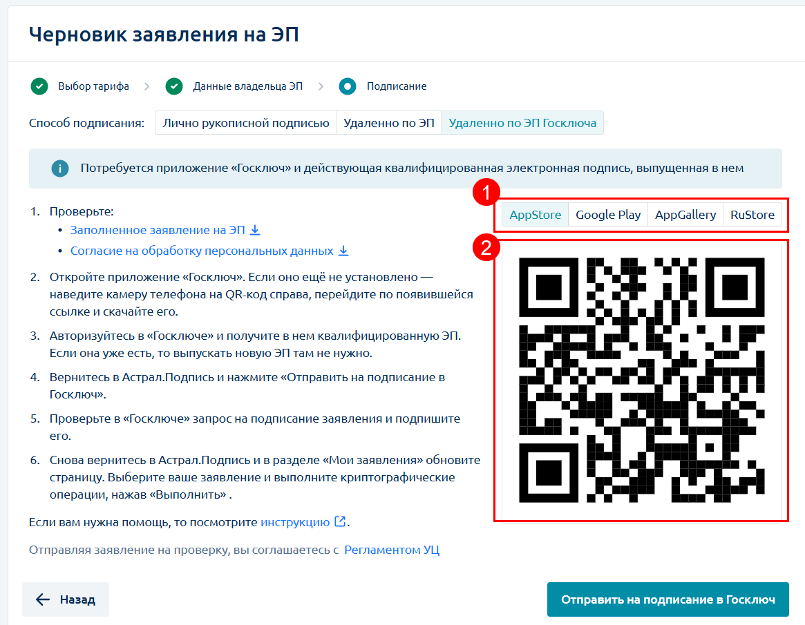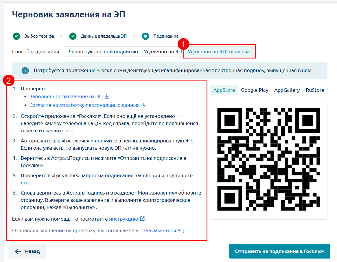 Чтобы подписать заявление электронной подписью Госключа, выберите способ подписания Удаленно по ЭП Госключа (1). Ознакомьтесь с инструкцией (2):