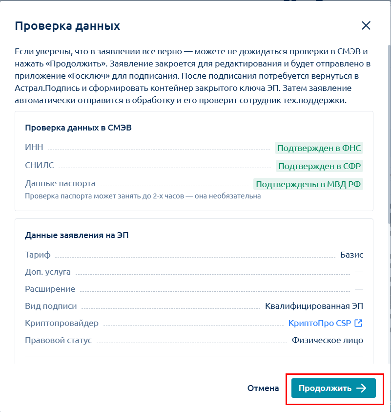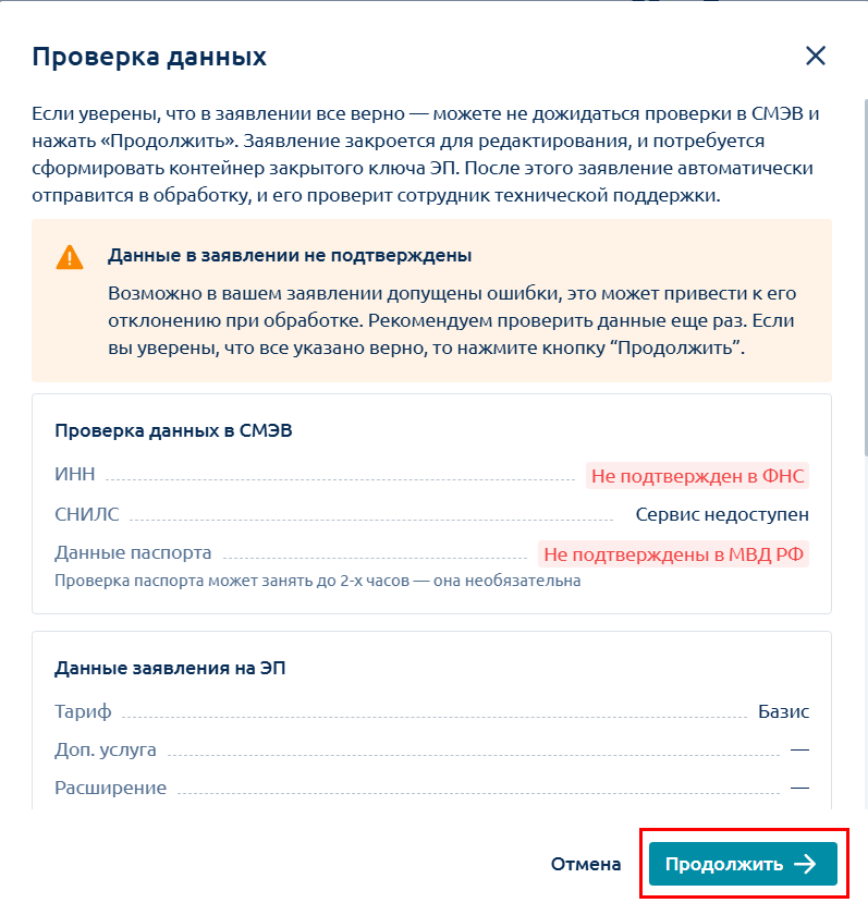 Запустится проверка данных в СМЭВ (Система межведомственного электронного взаимодействия). Если уверены, что в заявлении все верно и не хотите дожидаться окончания проверки, нажмите кнопку Продолжить: