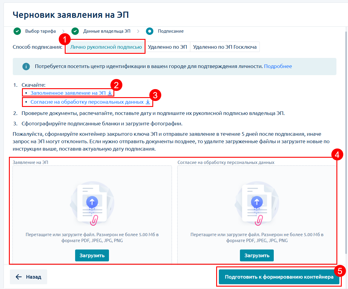 Чтобы подписать заявление вручную, выберите способ подписания Лично рукописной подписью (1). Скачайте, проверьте, распечатайте и подпишите: заявление на ЭП (2), согласие на обработку персональных данных (3). Загрузите скан-копию/фото подписанного заявления и согласия на обработку ПД в соответствующие блоки, нажав кнопку Загрузить (4). Нажмите кнопку Подготовить к формированию контейнера (5):