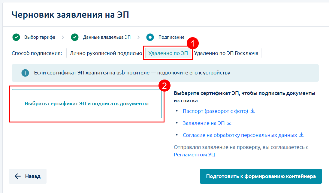 Чтобы подписать заявление электронной подписью, выберите способ подписания Удаленно по ЭП (1). Нажмите кнопку Выбрать сертификат ЭП и подписать документы (2):