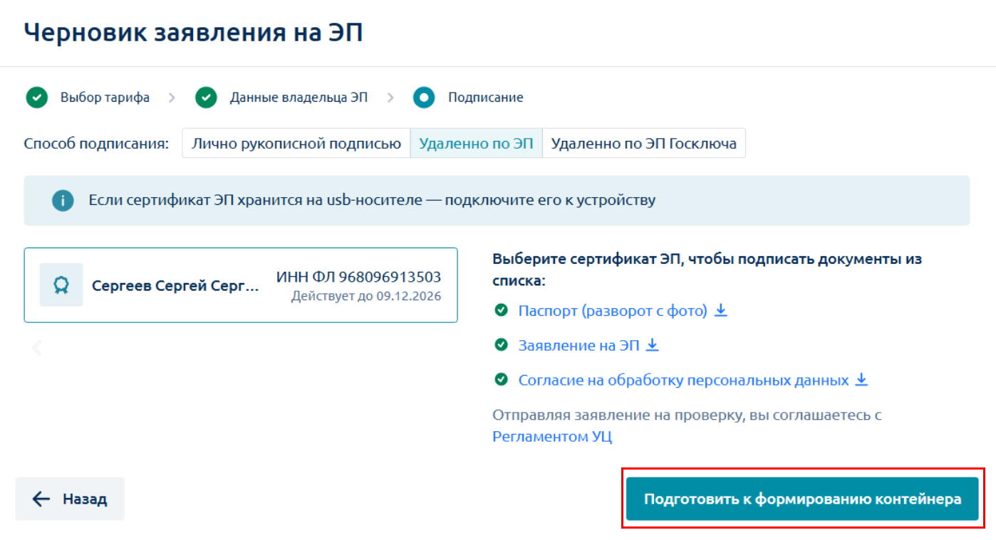 Перед отправкой заявления необходимо сформировать контейнер закрытого ключа ЭП. Для этого нажмите кнопку Подготовить к формированию контейнера: