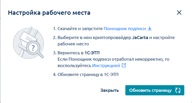 Произведите настройку рабочего места с помощью помощника подписи. Подробнее в статье Настройка рабочего места.