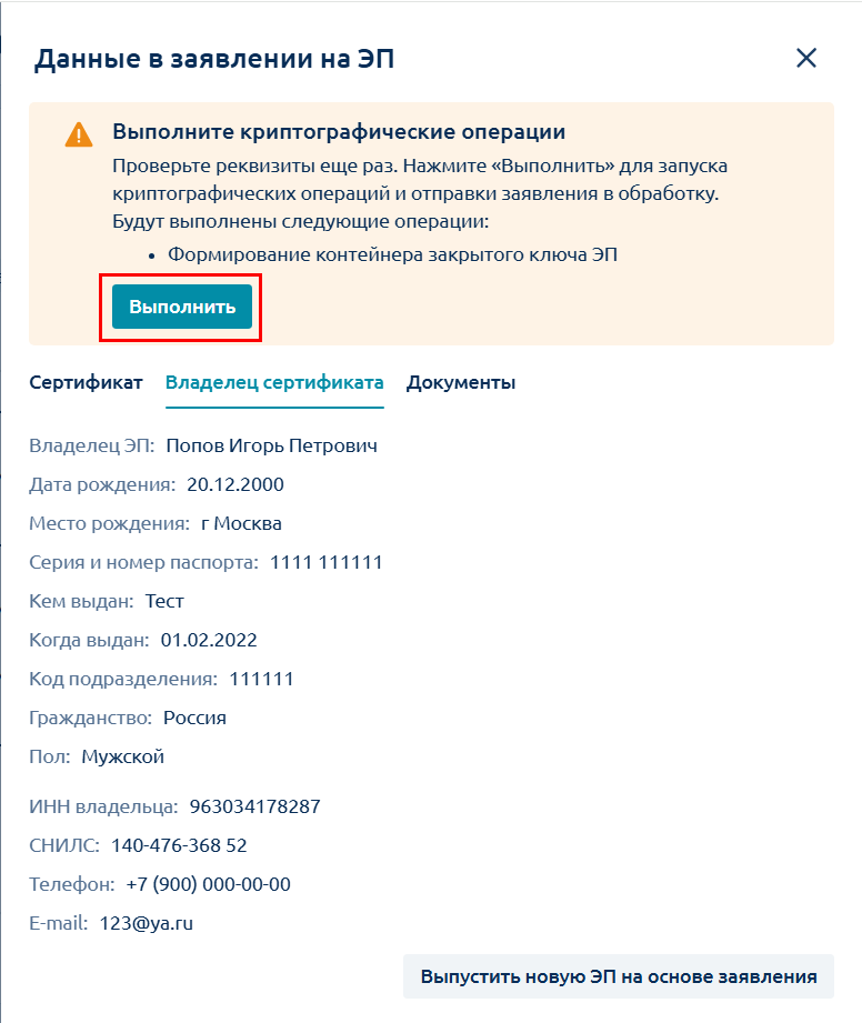 Блок Паспортные данные владельца ЭП содержит следующие поля для заполнения: