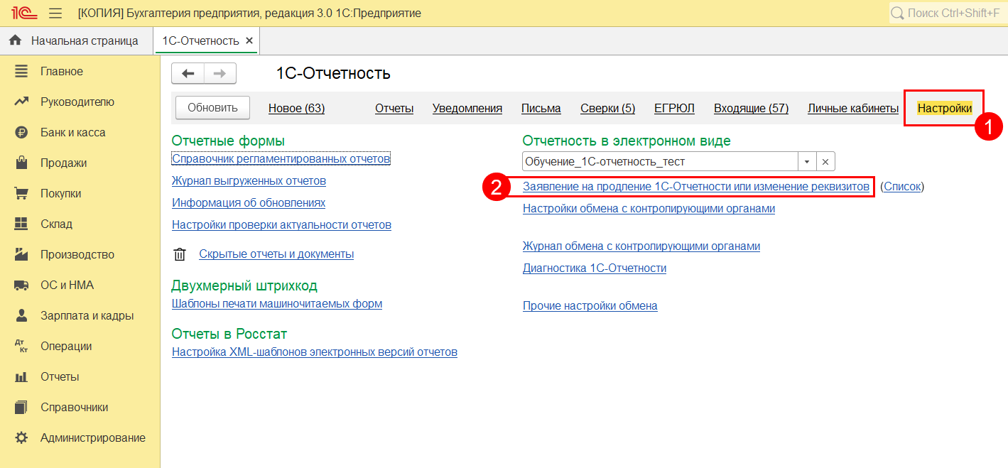 Для отправки заявления на подключение организации к ЛК перейдите по пути: Отчеты → Регламентированные отчеты → Настройки (1) и нажмите кнопку Заявление на продление 1С-Отчетности или изменение реквизитов Заявление на подключение к 1С-Отчетности (2):