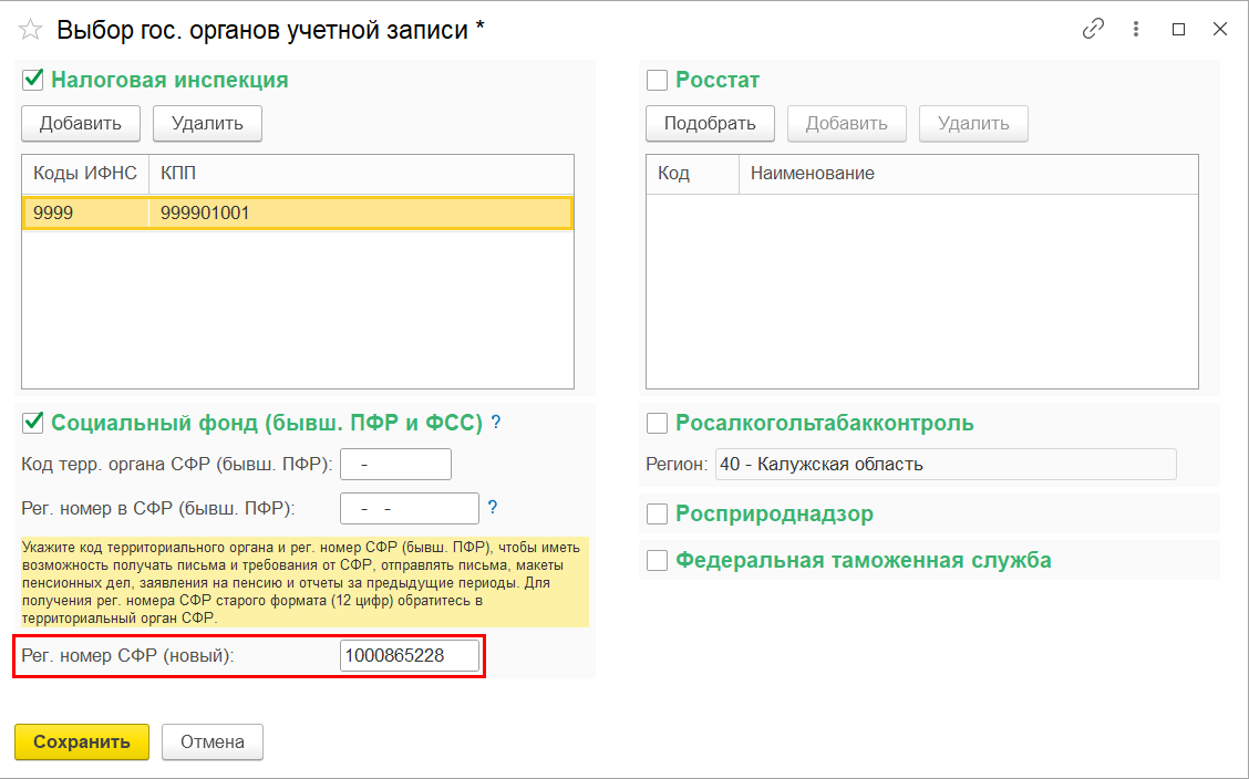 1С-Отчетность: Переход на единый регистрационный номер СФР
