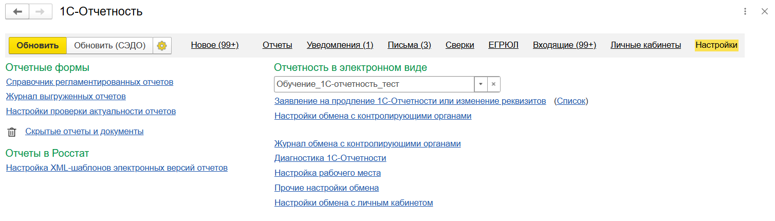 - Переход в настройки 1С-Отчетности