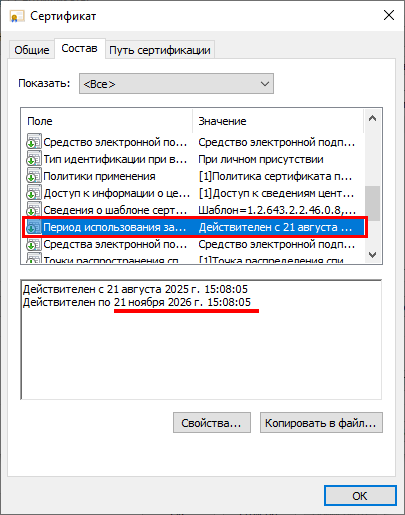 3. В разделе "Период использования закрытого ключа" проверьте срок действия закрытого ключа:
