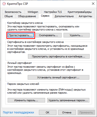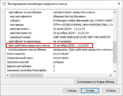 Откройте тестирование контейнера (способ 2) и в строке Ключ обмена проверьте наличие контейнера: