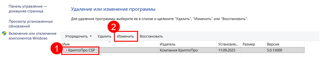 Для добавления компоненты перейдите в Панель управления → Программы и компоненты, выберите КриптоПро CSP и нажмите Изменить: