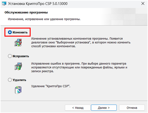 В открывшемся окне выберите пункт Изменить и нажмите кнопку Далее: