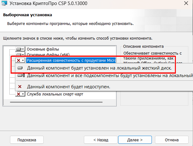 Найдите в списке компонент Расширенная совместимость с продуктами, для установки выберите пункт Данный компонент будет установлен на локальный жесткий диск: