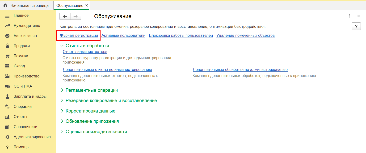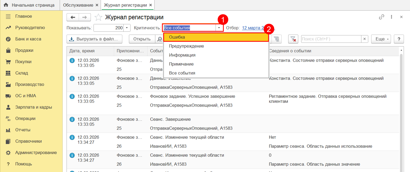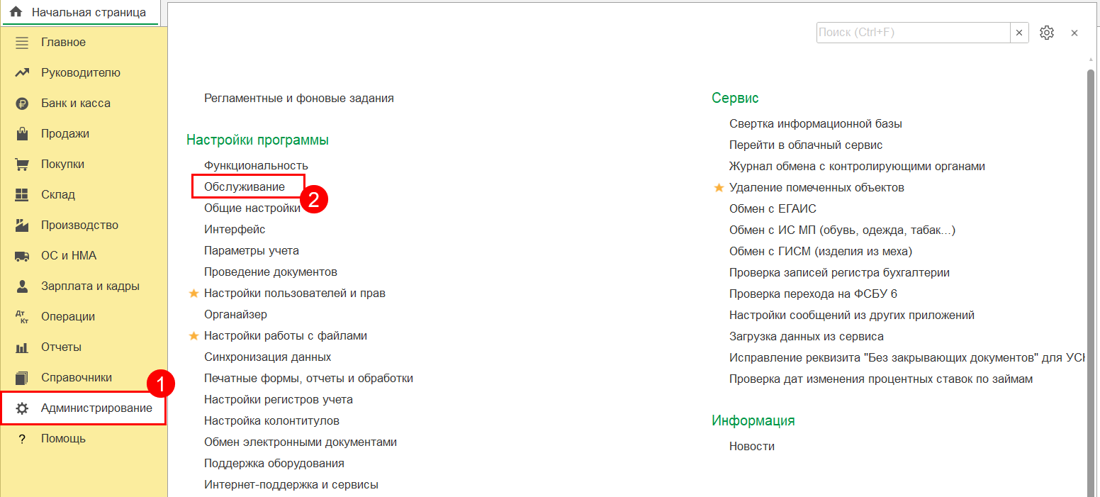 Если ошибка не исправлена, проверьте ошибку в журнале регистрации. Для этого в программе 1С перейдите в раздел Администрирование (1) → Обслуживание (2):