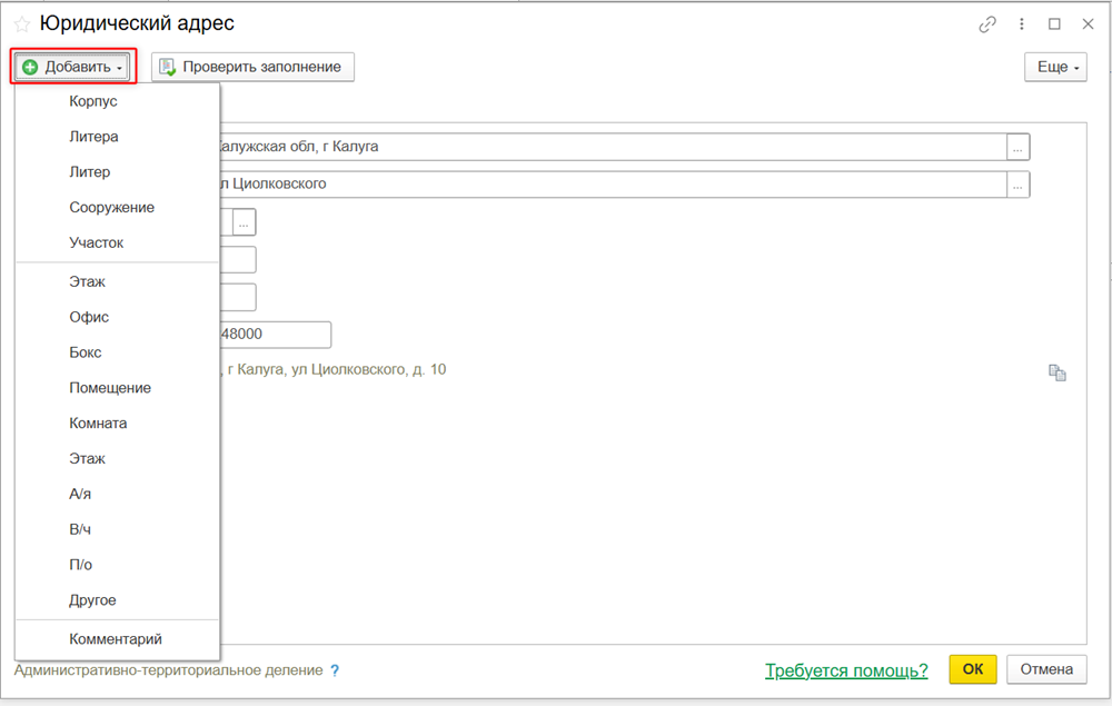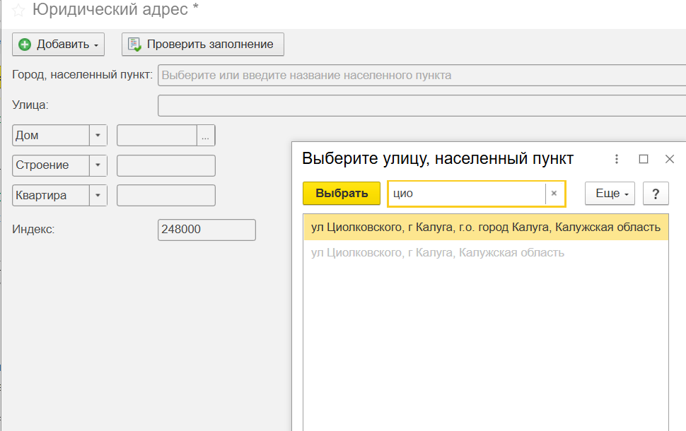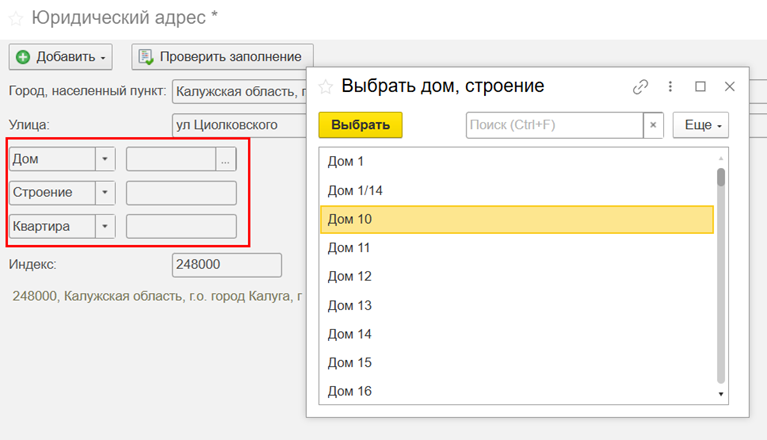 Адрес рекомендуется заполнять по индексу. Для этого удалите адрес и заполните поле Индекс. В открывшемся окне начните вводить адрес и выберите адрес из списка: