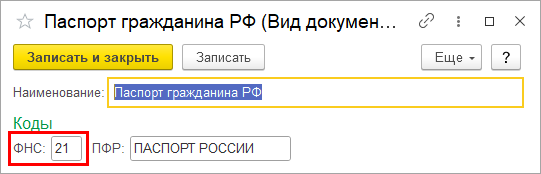 - В поле ФНС должно быть указано значение 21. Если поле пустое или указано другое значение, введите 21 и нажмите Записать и закрыть: