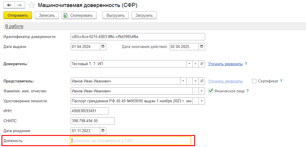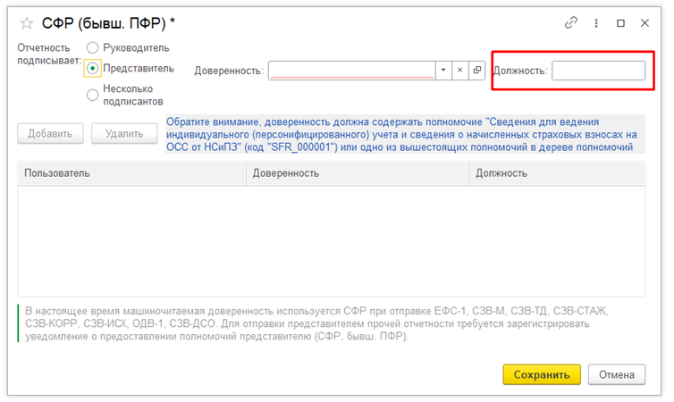 2. Заполните данные: перейдите в настройки используемой МЧД (или самой доверенности) для СФР и заполните поле Должность руководителя или уполномоченного представителя: