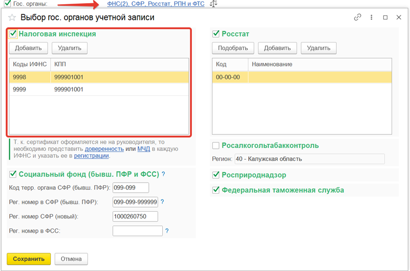 - для удаления ошибочного кода ИФНС выделите запись и нажмите кнопку Удалить;