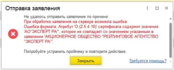 «Ошибка формата Атрибут S (2548) сертификата содержит значение '0'».