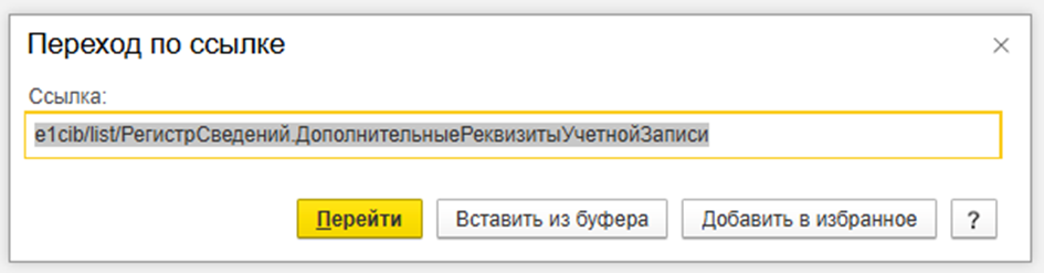 Перейдите в дополнительные реквизиты учетной записи. Для этого в любом окне программы 1С нажмите сочетание клавиш Shift+11, введите ссылку e1cib/list/РегистрСведений.ДополнительныеРеквизитыУчетнойЗаписи и нажмите кнопку Перейти: