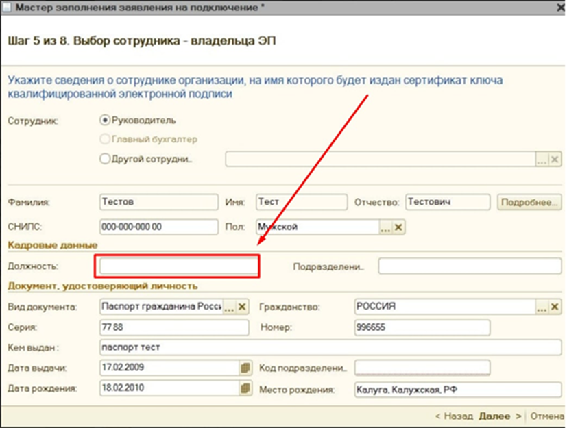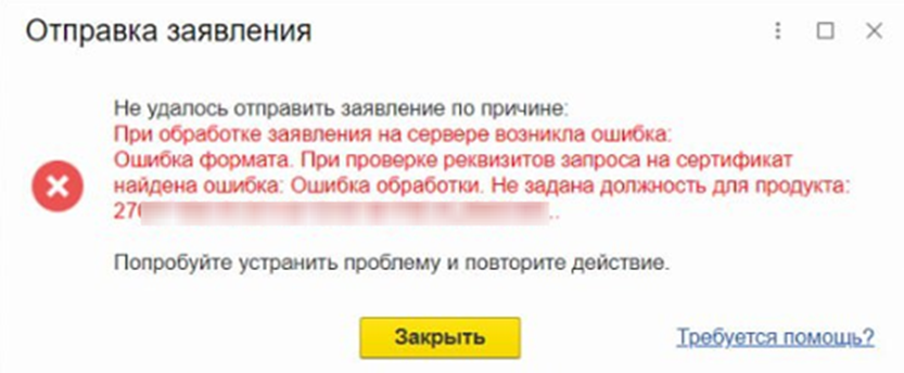 «Ошибка формата. При проверке реквизитов запроса на сертификат найдена ошибка: Ошибка обработки. Не задана должность для продукта».