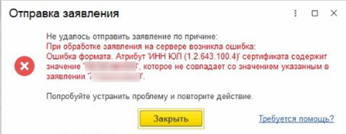 «Ошибка формата. Атрибут ИНН ЮЛ (1.2.643.100.4) сертификата содержит значение X, которое не совпадает со значением указанным в заявлении Y».