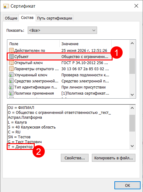 Проверьте наличие должности (атрибута T) в составе сертификата. Откройте сертификат и перейдите на вкладку Состав. В открывшемся списке нажмите на строку Субъект (1) и проверьте наличие должности в сертификате (2):