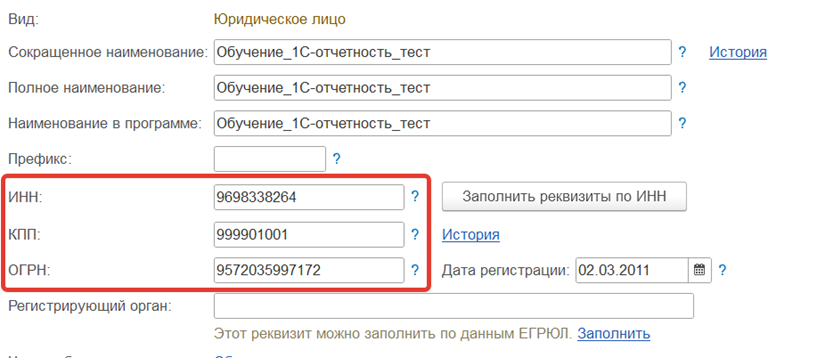 1. На вкладке Основные проверьте корректность заполнения реквизитов организации: ИНН, КПП и ОГРН: