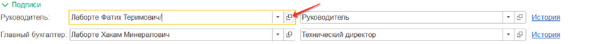 2. В блоке Подписи проверьте данные руководителя. Для этого в строке Руководитель нажмите кнопку Открыть: