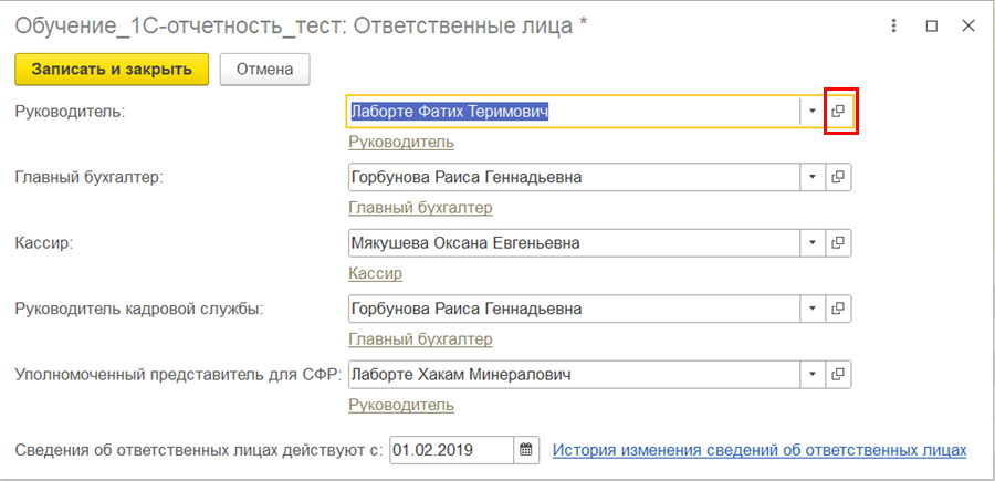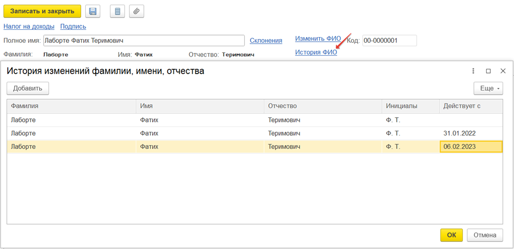 3. Проверьте, отсутствуют ли дубли физического лица. Для этого в карточке физического лица нажмите гиперссылку История ФИО. Если есть старые записи, удалите их и сохранить изменения. А также в графе Действует с проверьте актуальную дату действия руководителя: