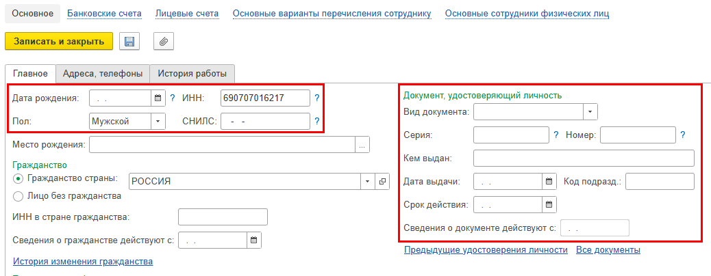 В карточке физического лица проверьте корректность заполнения данных: ИНН, СНИЛС, Дата рождения, Пол и Документ, удостоверяющий личность.