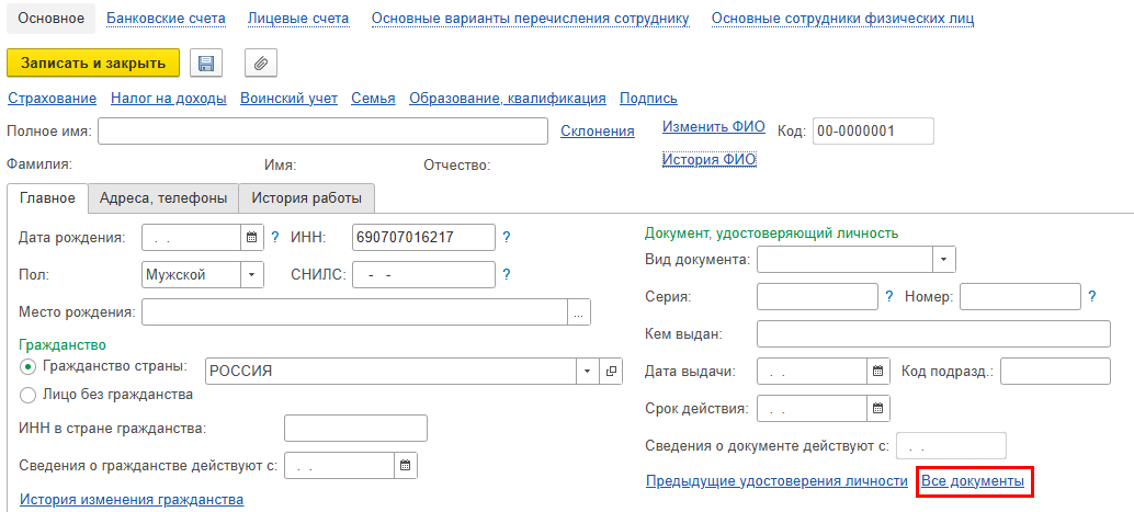 4. Проверьте, отсутствуют ли дубли документов по физическому лицу. Для этого в карточке физического лица нажмите гиперссылку Все документы: