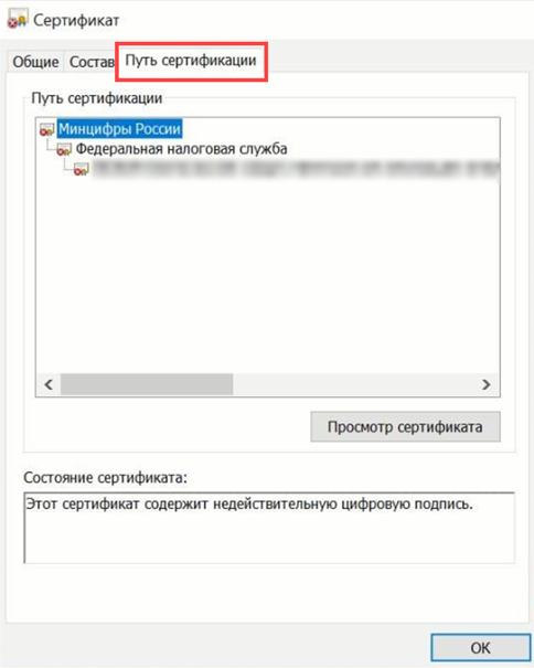 Чтобы проверить цепочку сертификации, откройте сертификат. Подробнее в статье Настройки учетной записи документооборота. Затем откройте раздел Путь сертификации: