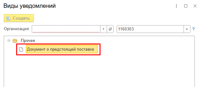 В разделе Прочее откройте Документ о предстоящей поставке или найдите документ, указав КНД 1160303 в строке поиска: